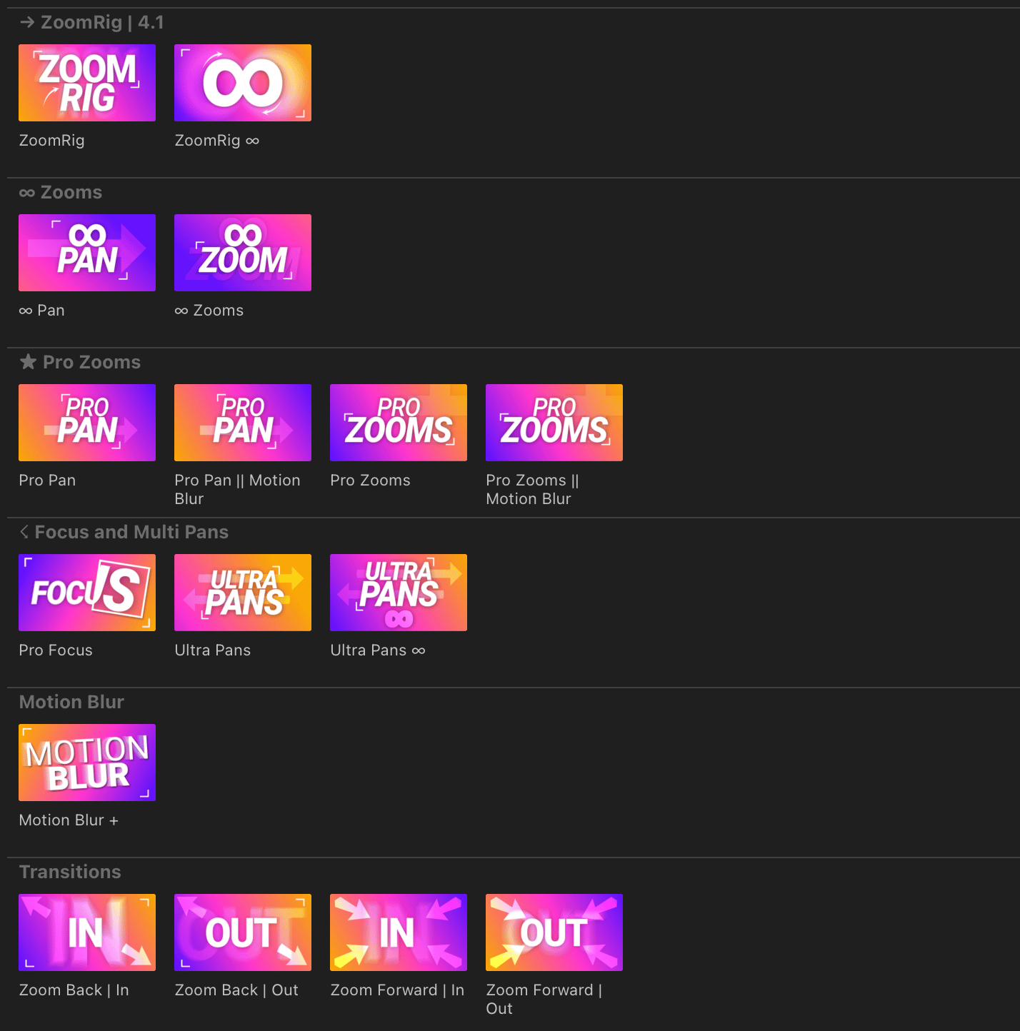 All of the great additions of ZoomRig, but now your zooms can be infinite in length. Create the best ever looking slow zooms, quick zooms, dolly's and so much more.